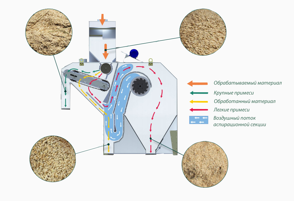 Зерно, легкие и мелкие примеси проходят через него, а крупные примеси (солома, колоски и др.) выводятся сетчатым транспортером (7) из машины. Материал, прошедший сквозь сетчатый транспортер (7), делится на два потока и поступает во всасывающий канал аспирации (8). Далее продукт проходит через датчик подпора (13), который предназначен для отключения машины при забивании зерном выгрузного лотка. Замкнутый воздушный поток в машине создается встроенным диаметральным вентилятором.